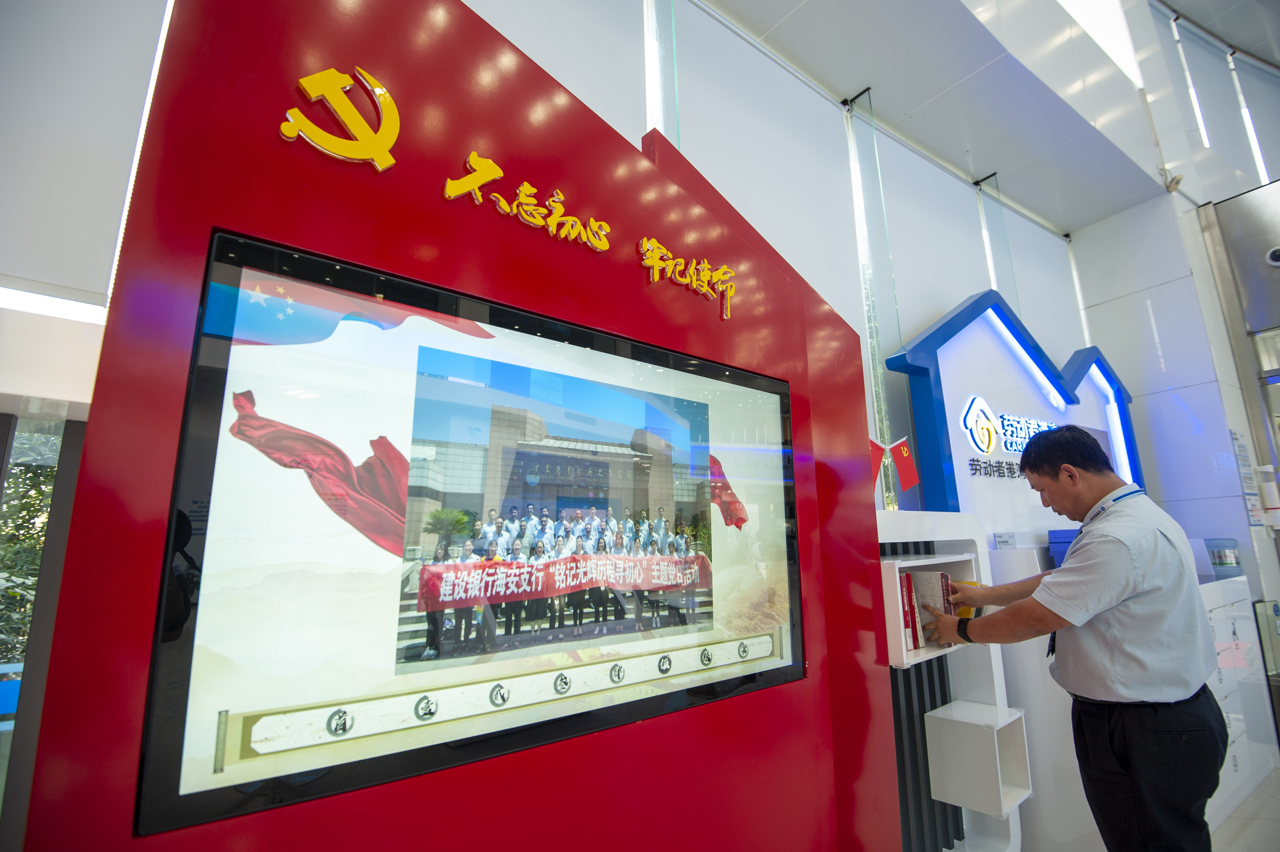 建行海安支行营业部员工在党建特色港湾整理和更新党建读物。