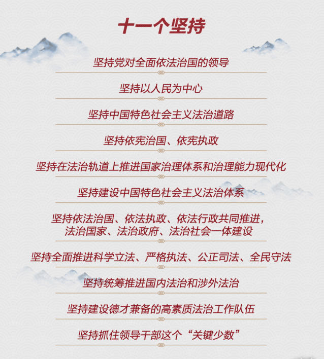 这次会议提出的习近平法治思想,深刻回答了新时代为什么实行全面依法治国、怎样实行全面依法治国等一系列重大问题。习近平总书记在讲话中强调的“11个坚持”,构成了习近平法治思想的主要内涵。