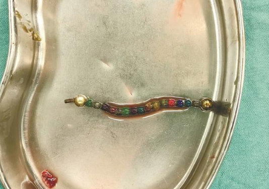 通大附院小儿外科印其友副主任发现小孩处于休克状态,立即启动了绿色通道,将小欣欣送至急诊抢救室,与儿内科专家一起抢救。经过一系列的检查发现,欣欣腹腔内有一串珠状异物,并形成部分肠梗阻以及胃穿孔现象。追问家长病史,家长却一头雾水,表示不知道孩子什么时候把异物吃进了肚子里。