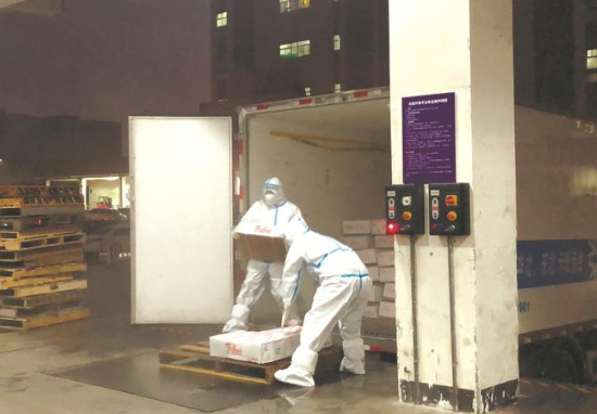 在卸货区,10余名身着防护服的工作人员已整装等候多时。“搬运人员拿托盘,开厢!”指挥员一声令下,冷链车货厢门打开,两名搬运人员开始配合卸货。此时,一旁的采样、消杀人员也全部就位,随时待命。