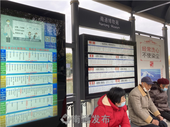 昨天上午,记者来到南通博物苑附近的公交站台前,尽管天气寒冷,但仍有不少乘客在候车。近3米高、1米宽的不锈钢边框公交电子显示屏上,公交线路、当天天气、公益小贴士一应俱全。最贴心的是,公交车距离本站还有多少站、多少米,即将抵达的班次车厢内是拥挤还是宽松,一目了然。“我平常坐公交出来就是买菜、买东西,今天出来玩玩,公交到哪里在这个屏幕上就能看到,很方便。”专程来南通博物苑“打卡”的市民陈大爷笑着说道。