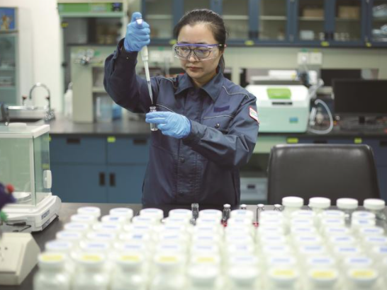 昨日,南通醋酸纤维有限公司(简称南纤公司)研发人员在做实验。今年该公司实现产值超60亿元,税收超过13亿元,创历史新高。 今年以来,崇川区统筹推进疫情防控和经济社会发展,加强科技研发力度,有效落实积极的财政政策,以南纤公司为代表的一批龙头企业为 全区今年完成一般公共预算收入120.5亿元、在全市率先突破百亿大关做出贡献。 王俊荣摄