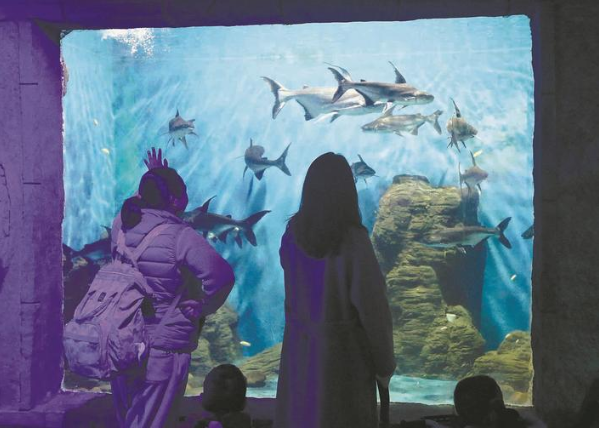 南通海底世界内,游客观赏蓝鲨。 记者尤炼