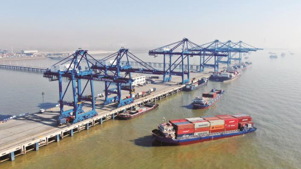 昨日在通海港区拍摄的集装箱堆场和繁忙的集装箱码头。据南通市交通运输局发布的信息,2020年,南通港集装箱保持快速增长态势,累计完成集装箱吞吐量191.1万标箱,同比增长24%,创下历史新高。 记者 许丛军摄 |
