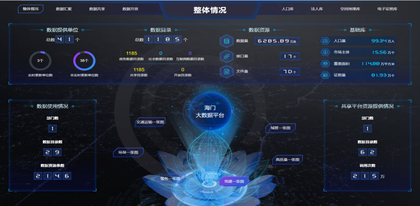 依托大数据库,通过‘指挥中枢’即可对整个城市运行实现超强感知,精准分析。通过政务数据共享交换平台,实现了全域数据的集中汇聚、集智分析、集成共用。目前,已经汇聚了海门全区41个部门的1000多个目录近6300余万条数据,每天数据交换量超过3万条。此外,在原网格化智能应用平台基础上研发区镇一体化指挥平台,实现了县级标准版平台对接,完成了数据共享交换。搭建联动指挥系统、党建、城市管理、高质量发展、社会治理、乡村振兴“1+5+N”功能模块架构,统一汇聚12345政府公共服务热线、网格化服务管理平台、数字城管、微博微信等渠道数据来源,实行了多平台受理、一体化处置。