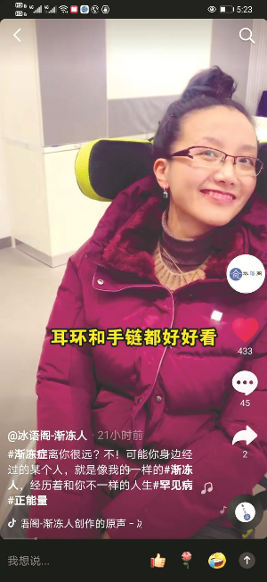 23日,被媒体誉为“冰雪女神”的渐冻症患者葛敏通过“冰语阁—渐冻人”抖音号发布了一条新年逛街视频,引发了众多网友围观和热评。