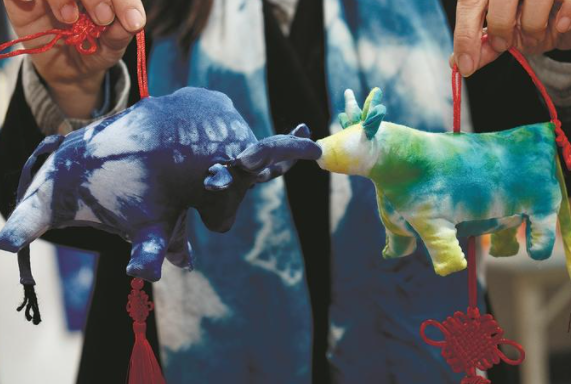 李娟介绍,今年团队制作出了两个造型的牛年吉祥物——斗牛威猛,象征牛气冲天;小牛耳大,象征福大招财。整个作品采用纯棉面料,结合段扎法、叠扎法、捆扎法等不同扎染手法,使用纯天然的兰草做染料,制作出不同纹理。之后再进行裁剪、缝制的步骤,制作出独一无二的小牛。