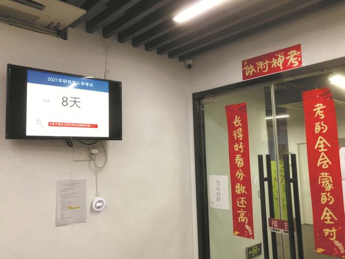 目前大型考试告一段落,自习室里没有了往日的爆满,陈鹏和沈嘉玮都有种送学生毕业的感觉。“感觉心里空落落的”,而自习室已经换上了新的倒计时牌。