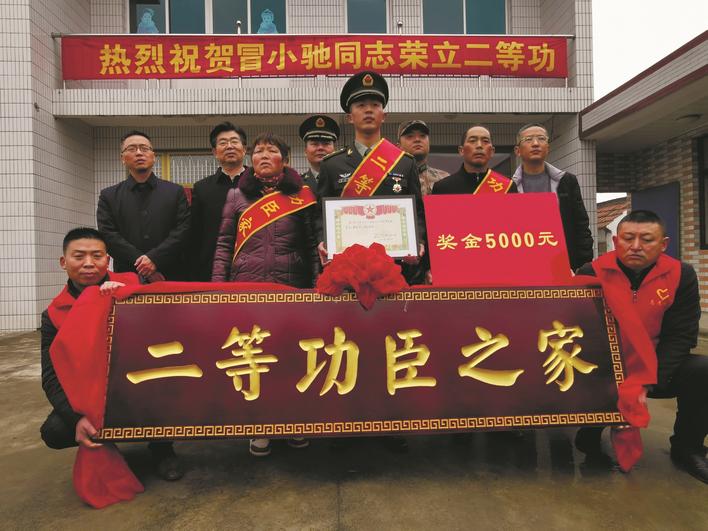 “抗洪英雄冒小驰荣立二等功啦!”昨天,通往如皋市东陈镇雪东社区6组的路上,鞭炮声、腰鼓声响个不停。陆军72集团军某旅政治部主任刘志强,如皋市委常委、人武部部长夏淼,如皋市副市长张百璘等军地领导来到抗洪英雄冒小驰的家,送上“二等功臣之家”的光荣匾。