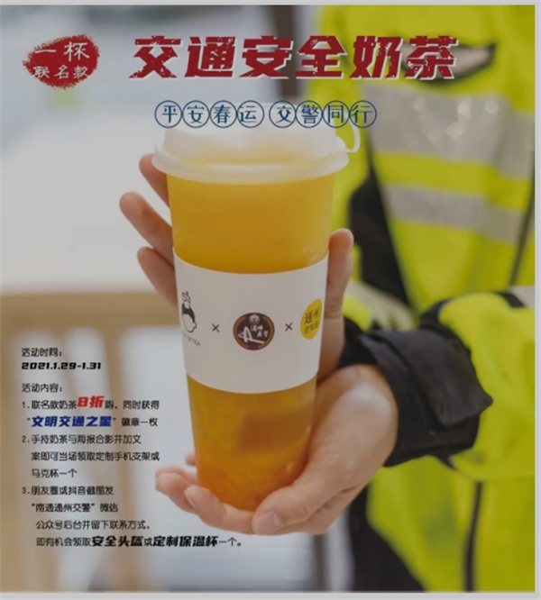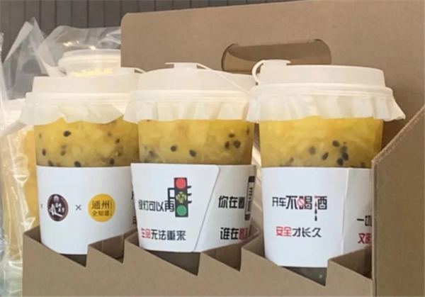“你在看手机,谁在看路”“开车不喝酒,安全才长久”“绿灯可以再等,生命无法再来”……杯套上印着一句句短小精悍又发人深省的话:这样的奶茶让交通安全宣传多了不少“烟火气”。