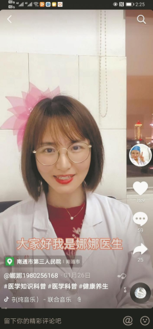 春节前夕,徐丽娜还首次尝试了抖音直播,与好友李胜利连线同台直播,直接语音对话网友,令她既紧张又激动。“目前,好几个来自不同医院的同行,纷纷开设了抖音号,还建立了一个微信群,群名为‘为健康奔走相告’。因为我们来自不同的专业,可以通过线上MDT(多学科诊疗)的形式,帮助到一些患有多种基础疾病的患者,同时也能交流彼此的视频拍摄心得,共同成长。”