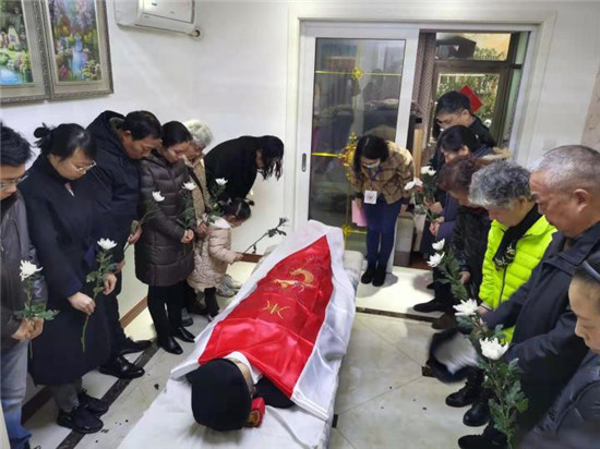“锦泉,你的遗愿我们帮你实现了,放心吧。”25日,在去世党员徐锦泉位于城南新村的家中,一个简朴的告别仪式正在进行。徐锦泉的爱人王林将雪白的菊花放在他身上,泣不成声。在南通市、崇川区红十字会工作人员和亲友的见证下,徐锦泉的遗体被南通大学医学院接走,将用于医学研究。