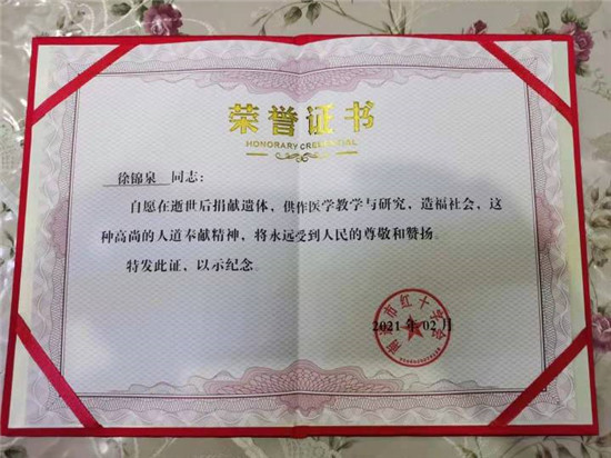 做出决定当天,两个人联系了在北京的儿子徐鹏,和家里的亲戚朋友也打了电话说明。“爸爸的这个心愿很伟大,我们无条件支持。”徐鹏说。这个决定曾一度让徐锦泉的两位姐姐无法接受,“传统想法是入土为安,我们舍不得弟弟啊。”姐姐、姐夫曾轮流做徐锦泉和王林的工作,但徐锦泉没有动摇,反而做通了姐姐们的工作:“人死了不过是烧成灰、占个地方,如果能捐献遗体,能为国家做最后一点贡献,这是我作为党员的荣誉。”“其实锦泉做出这个决定我们不意外。”他的大姐介绍,徐锦泉是个开朗、热心的人,做了一辈子“先进”,家里收藏的、他的荣誉证书有厚厚的一叠。