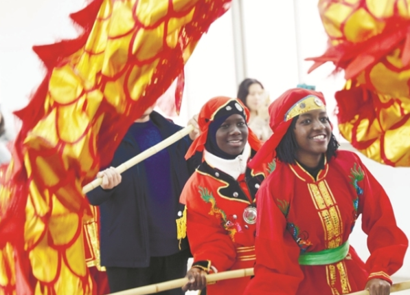 昨天,来自南通职业大学纳米比亚、尼日利亚等国的留学生们走进崇川区陈桥街道育爱村,在天生港镇街道八一村龙灯队队员的指导下学习舞龙,体验中国的传统节日民俗,迎接元宵节的到来。 记者徐培钦