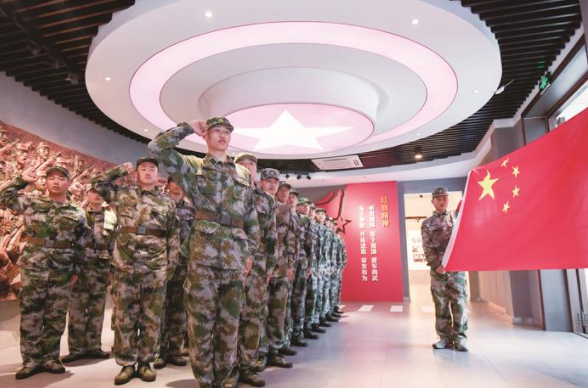 15日,海安市组织开展2021春季应征入伍新兵欢送仪式,通过开展参观角斜红旗民兵团史绩陈列馆、宣誓、听老兵讲故事等活动,传承红色精神,调动了广大青年的爱国热情。 姜明摄