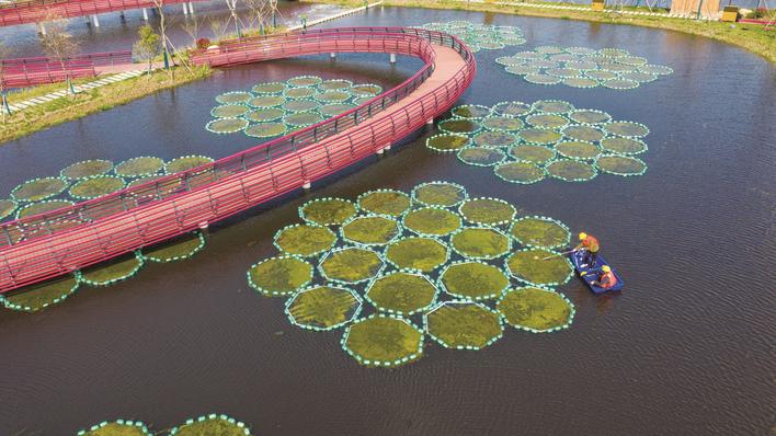 昨天,位于海安市孙庄街道的鹰泰生态安全缓冲区内,工人正在打捞水生植物附着青苔。 近年来,海安市大力推进水环境治理,充分发挥自然生态系统的净化降解功能,先后建成安全生态缓冲区10个,持续改善尾水水质,为环境增容,为企业减负。 翟慧勇 徐燕摄