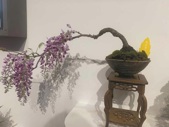 通派盆景蟠扎技艺传承人、南通科技职业学院客座教授袁华介绍:“本次展出的通派盆景,‘年龄’最大的有50年历史,最‘年轻’的也有7至8年的历史。”袁华介绍,通派盆景形成于宋元,盛于明清,发展于近代。通派盆景的显著特色是选用尖短小叶罗汉松(俗称雀舌罗汉松)为材料,攀扎成“二弯半”的造型,制作严谨,棕法细腻,像是一幅立体画。“所谓‘两弯半’就是将主干弯曲成‘座地弯’‘第二弯’‘半弯’形成优美灵动的曲线。像这盆‘两弯半’造型的雀舌盆景,我亲手养护了48年。”