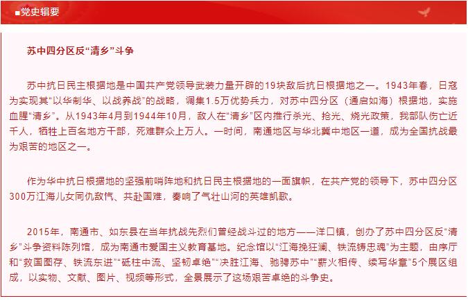 “苏中四分区反‘清乡’斗争,坚持19个月,300万军民众志成城,筑起了一道攻不破的钢铁长城。”来到苏中四分区反“清乡”斗争资料陈列馆,伴随讲解员顾玉彦声情并茂的讲解,走进时隔70多年的光辉岁月,追寻300万军民抗战义举,感受最深的是江海儿女坚如磐石的信念,向死而生的伟大力量。