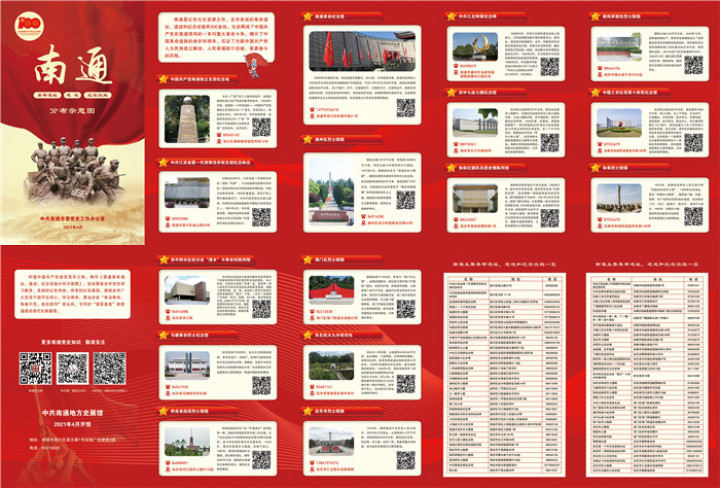 南通是红色文化资源大市,全市有革命遗址、遗迹和纪念设施300多处。翻开这份特制的“红色地图”,中国共产党南通独立支部纪念地、南通革命纪念馆、苏中七战七捷纪念馆、中国工农红军第十四军纪念馆、苏北抗大九分校旧址等70多处红色文化资源的空间分布尽显于方寸之间,一目了然。同时,图文并茂地介绍了中国共产党南通独立支部纪念地等16处红色资源,并配附了《南通主要革命遗址、遗迹和纪念设施一览表》。