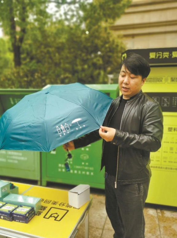 回收之后的“废品”去了哪里?侯丕天介绍,居民投递的可回收物在末端环节会被按照不同品类进行精细分拣,之后进入相应的回收再生产工厂,经过再生处理,最终“变废为宝”。“比如我们回收的PET瓶,经过再生处理后,可以‘变身’为雨伞、T恤衫、手提袋等各种物品,5个矿泉水瓶经过再生处理之后可以制作一把环保伞。”侯丕天介绍,通过把可回收物从生活垃圾里分离出来,可以实现1/3以上的垃圾减量,让这些再生资源免于和干垃圾一起被焚烧填埋,让它们物尽其用、循环再生。
