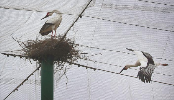 第二步:在靠近爱的过渡区的位置,将园区的鸟笼围网开一个门,以确认园区内具体哪只东方白鹳为“爱情鸟”的另一主人公。对于园内的东方白鹳,同样通过定点喂食的方式,让园区内的东方白鹳和野生东方白鹳能够在同一平面吃食,根据它们的互动情况分辨出,园区内的哪一只是它的爱人。