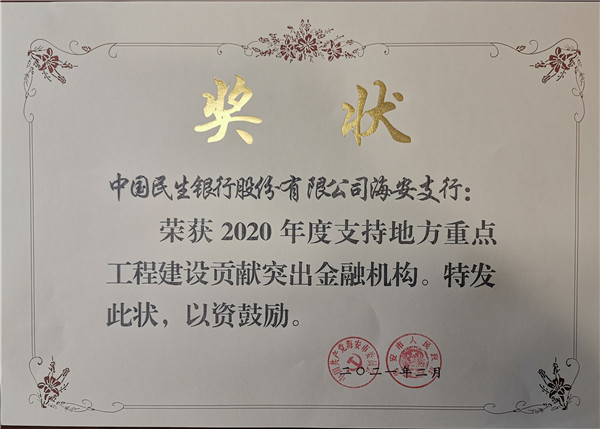 近期,海安市人民政府发文《市政府关于表彰2020年度金融机构服务地方经济社会发展先进单位的通报》,对海安市辖内2020年表现优异的金融机构进行表扬通报。中国民生银行海安支行被评为“2020年海安市支持地方重点工程建设贡献突出金融机构”。