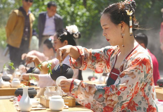 茶艺师身着汉服,伴随着缓缓的背景音乐,优雅又娴熟地向在场的游客们展示着茶道表演。茶艺师唯美的茶艺表演吸引了不少游客驻足观赏。表演结束后,茶艺师还将茶水与大家分享品尝,一起品味春天的味道。当天展示的茶叶为军山出品的“狼山春晓”。
