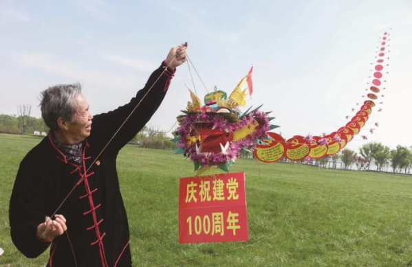 8日,海安78岁的老党员孙道峰在放飞自己制作的百米风筝。据介绍,为迎接建党100周年,他用了两个多月时间精心制作这条百米长的风筝,每节风筝缀上党旗表达对中国共产党的热爱之情。 姜 海摄 |