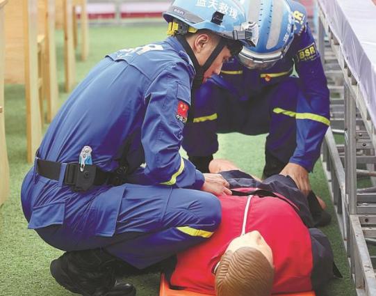 当日演练共设紧急避险演练、应急疏散演练、互助逃生演练、现场搜救演练、应急救护演练、心理疏导演练、消防技能演示7个科目。记者在现场看到,参加演练的师生们在警报响起后,有序从模拟教室撤离。现场模拟伤员在进行简单包扎后,通过担架运出。