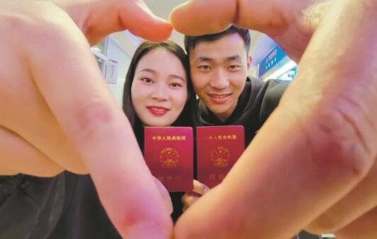 13日早上9点,小李和小王身着情侣服携手来到启东市民政局婚姻登记处,按照之前在网上预约的时间段和现场叫号顺序,不一会儿就办完了婚姻登记相关手续。小李的户籍在南通市崇川区,小王的户籍在安徽阜阳,俩人都在启东滨江精细化工园工作。