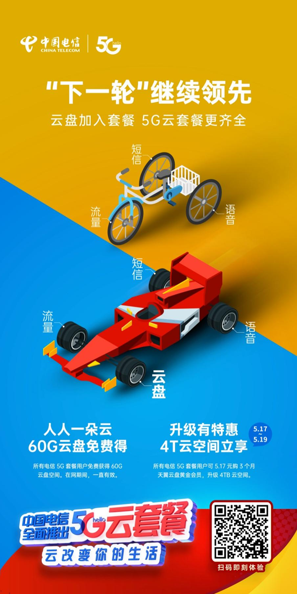 从5月17日开始,江苏电信全面升级 “云套餐”,所有电信5G套餐用户在原本的语音、短信、流量之外,将免费获得60G个人云盘空间,在网期间一直有效。此外,5月17日-19日,江苏电信还开启了云空间升级特惠,所有电信5G套餐用户均可以5.17元的特惠价获得3个月天翼云盘黄金会员,存储空间升级到4TB,并享受云解压、视频高速播放等热门功能。其中2TB存储空间可作为家庭共享空间,出去游玩拍的照片上传家庭共享文件夹,全家都能在电视端领略当地风光;还可以设置工作进度共享文件夹,让线上协作办公更高效。
