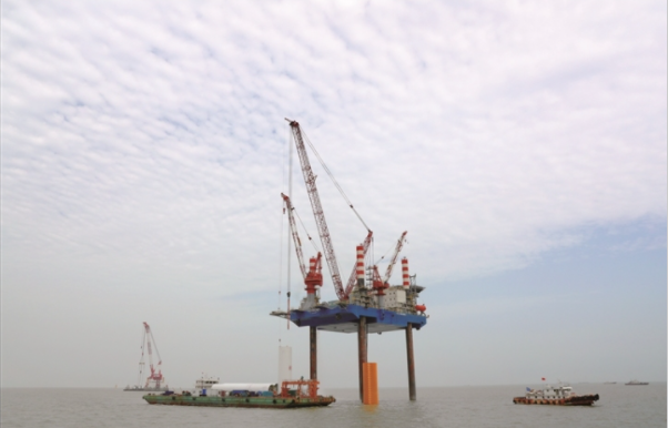 24日,华景海上风电施工平台在华能盛东如东海上风电场进行塔筒吊装。据介绍,华能盛东如东海上风电场建设有序推进,计划安装80台风力发电机组,目前已经完成安装72台,风电场预计今年6月并网投产。记者 许丛军摄 |