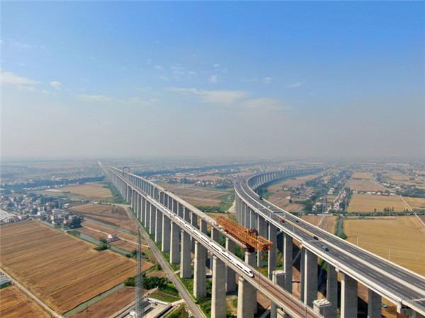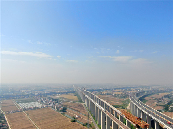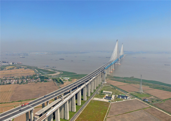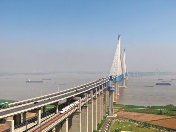 昨天,无人机航拍动车组驶出沪苏通长江公铁大桥。据上海铁路局集团有限公司新长车务段提供的信息,沪苏通铁路南通西站日均办客列车趟数增至62趟。 记者 许丛军摄