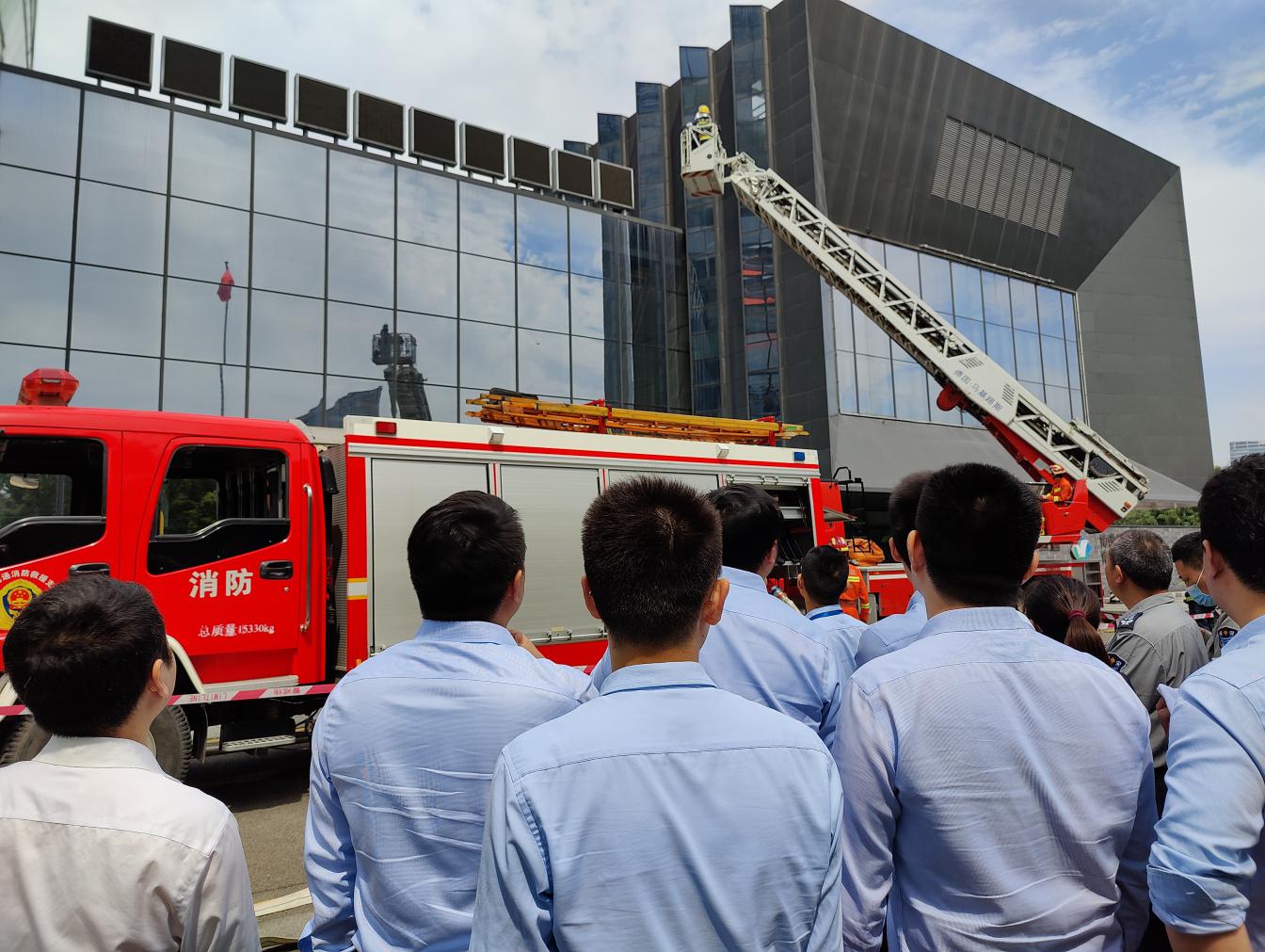 演练现场模拟大楼4楼食堂出现火情,并迅速蔓延至该行办公区域的情形。现场火势和烟雾较大,有员工“被困”,同时报警系统发出火灾警报。民生银行南通分行保安及监控室发现火情后与大楼消控室取得联系,并拨打119火警电话。民生银行南通分行各楼层保安、部门兼职安全员迅速根据应急预案组织大楼内员工疏散至一楼室外安全区域。南通市消防救援支队接警后调度周边救援站到现场进行灭火,进入大楼内部搜救,并使用云梯解救高层被困员工。通过民生银行南通分行参与演练人员与消防指战员密切沟通、配合,火情得到迅速控制,人员全部安全撤离。