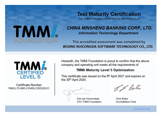 2021年6月26日,民生银行总行信息科技部获得国际TMMi组织认定的软件测试成熟度模型集成(TMMi)五级认证。