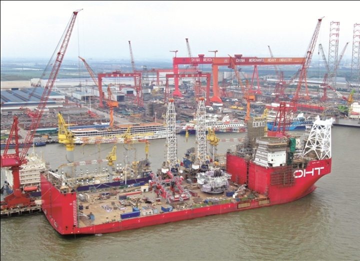 3日在招商工业海门基地拍摄的全球首制48000吨半潜重吊运输船。该船具有海上起吊能力强、载重量大、航速快、快速压载及节能环保等特点。记者 许丛军摄