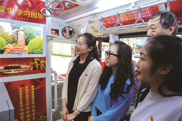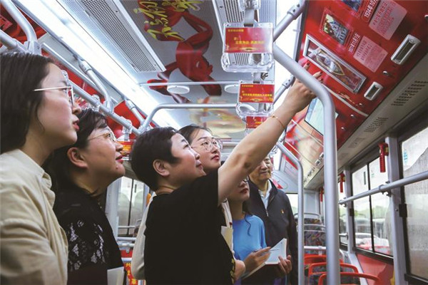 15路公交车是党史学习教育专线——“开往新时代的红巴士”!“红巴士”车身整体以红色为主色调,贴有“学党史、悟思想、办实事、开新局”“奋斗百年路 启航新征程”等红色标语;车厢两侧,以时间为轴,图文并茂地展示党的发展历程,车内挡板、扶手、拉环等,随处可见党史学习教育元素。车厢里,浓郁的党史学习教育氛围如清风拂面……