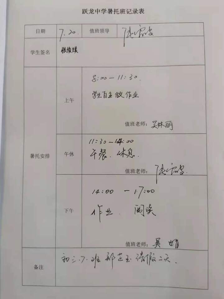 在市跃龙中学,该校初三学生张俊琪更是受到了空前礼遇。因为该校原本有两名学生报名参加暑期托管服务,但是其中一名同学在20日前突然告知学校,请假一天。当记者赶到时,该校物理学科备课组长吴娟,学生处主任陆雷波和该校校长胡建三人,在该校督导室内,看护一个同学。面对三位老师不时的目光关注,虽然能正常完成作业和开展阅读,但按照张俊琪的话说:“有一点紧张。”