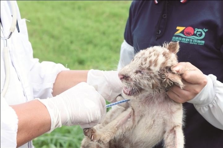 昨日是“全球老虎日”,南通森林野生动物园刚出生一个月的孟加拉小白虎三胞胎进行了疫苗接种并与游客见面。 记者 徐培钦摄