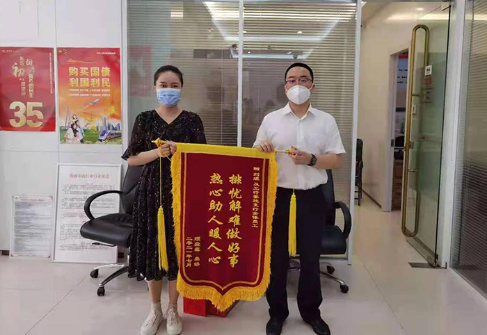 7月22日,家住南通市通州区川姜镇居民龚女士,将一面写有“排忧解难做好事、热心助人暖人心”的锦旗,送到工商银行南通姜灶支行工作人员手中,由衷地感谢该行,想客户所想、急客户所急,为客户挽回1万多元的利息损失。