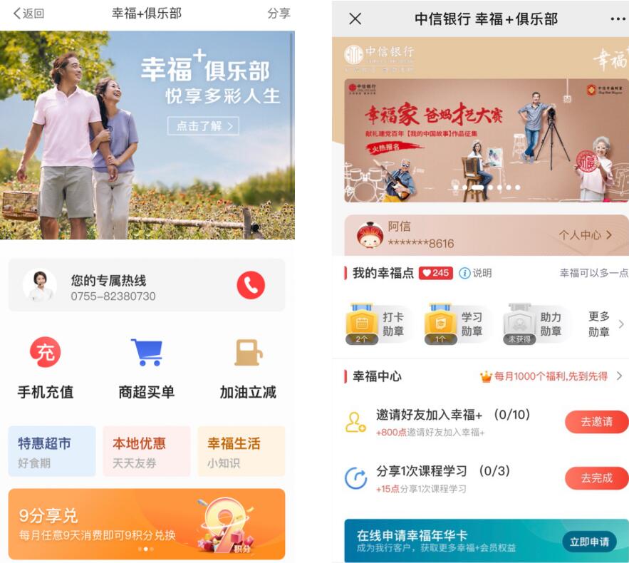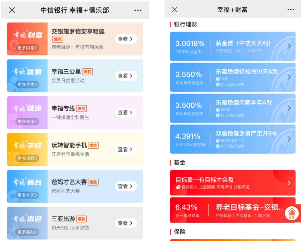 中信银行“幸福+”是国内著名的老年金融服务品牌,包括老有所养“幸福+财富”、老有所医“幸福+健康”、老有所享“幸福+优惠”、 老有所学“幸福+学院”、老有所游“幸福+出游”、老有所乐“幸福+舞台”六大服务板块,打造了慢病管理、电话家庭医生、幸福三公里、老年课程、幸福专线、“幸福家爸妈才艺活动”等多项深受老年客户喜爱的爆款服务和活动。