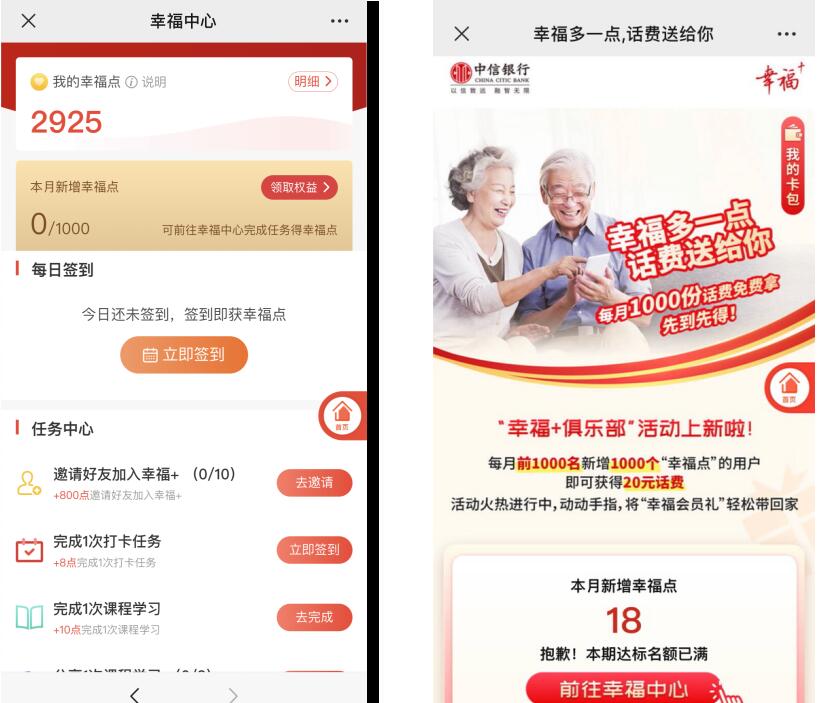 在“中信银行”微信公众号搜索“幸福”,点击进入“幸福+”俱乐部,用手机号码注册成为会员即可学习,同时,记者还发现,“幸福+”俱乐部会员通过签到、学习、打卡、分享,还可以积累“幸福点”,每月幸福点达到一定标准还可以兑换手机话费等权益。