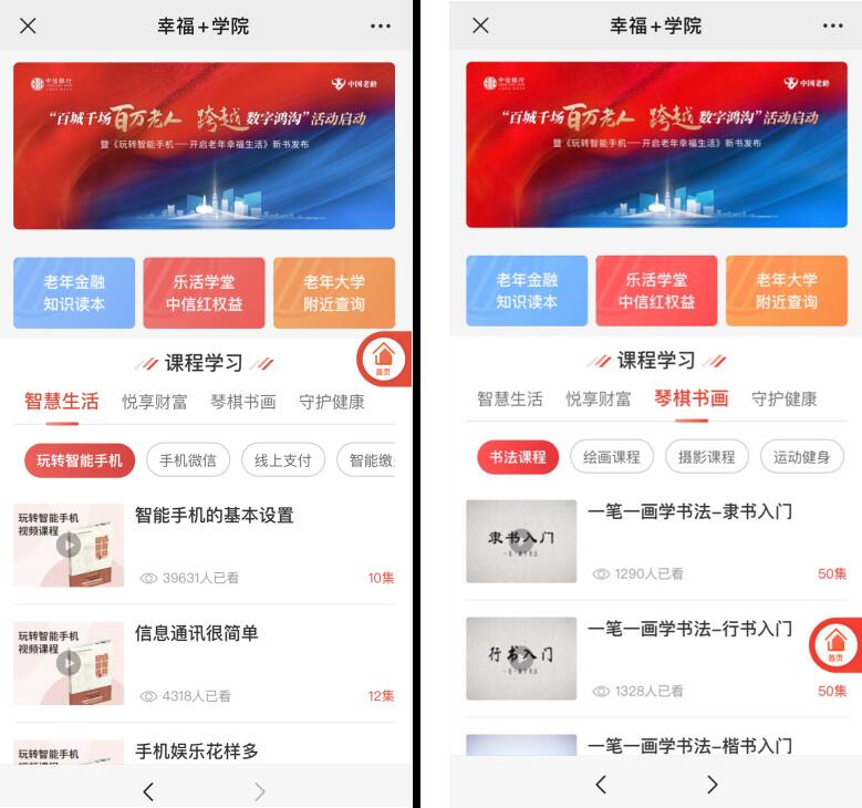 中信银行专门给老年朋友准备的“课程学习”一共有智能生活、悦享财富、琴棋书画和守护健康四大板块,都是老年朋友需要和关心的内容,总课程2000余节,总时长超过1.8万分钟。