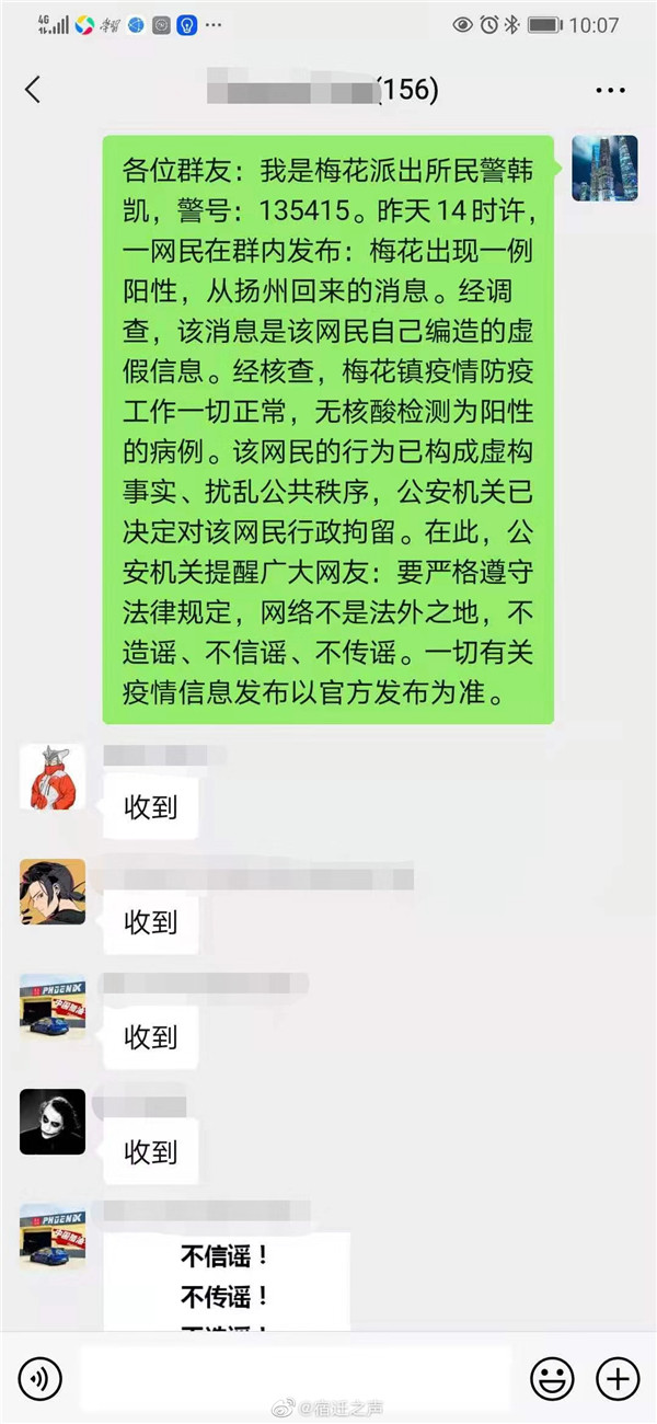 8月3日下午,泗洪县一网民石某为了博人眼球,便捏造“(泗洪县)梅花(镇)出现一例(核酸检测)阳性,从扬州回来。