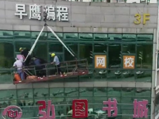 9月5日,启东市区永安广场附近拉起了警戒线,一辆大型吊车伸出了10多米长的吊臂直冲天空,楼顶上一群头戴安全帽的工人正在有条不紊地忙碌着,他们正在对学科类培训机构的违法广告牌进行切割和拆除。