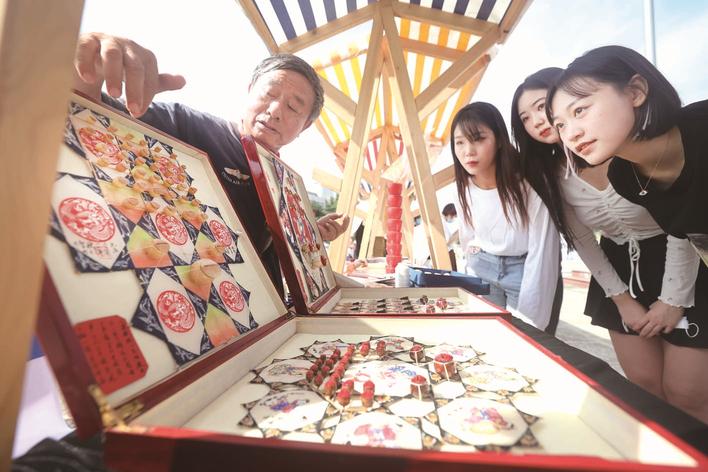 在活动现场,非遗集市各个摊位上人头攒动,南通糖画、草鞋底、西亭脆饼、嵌桃麻糕等香味扑鼻的传统美食吸引着往来的学校师生驻足品尝;蓝印花布、南通仿真绣、南通灯彩、杖头木偶戏……一系列精美的非遗产品体现着南通丰厚的文化底蕴。