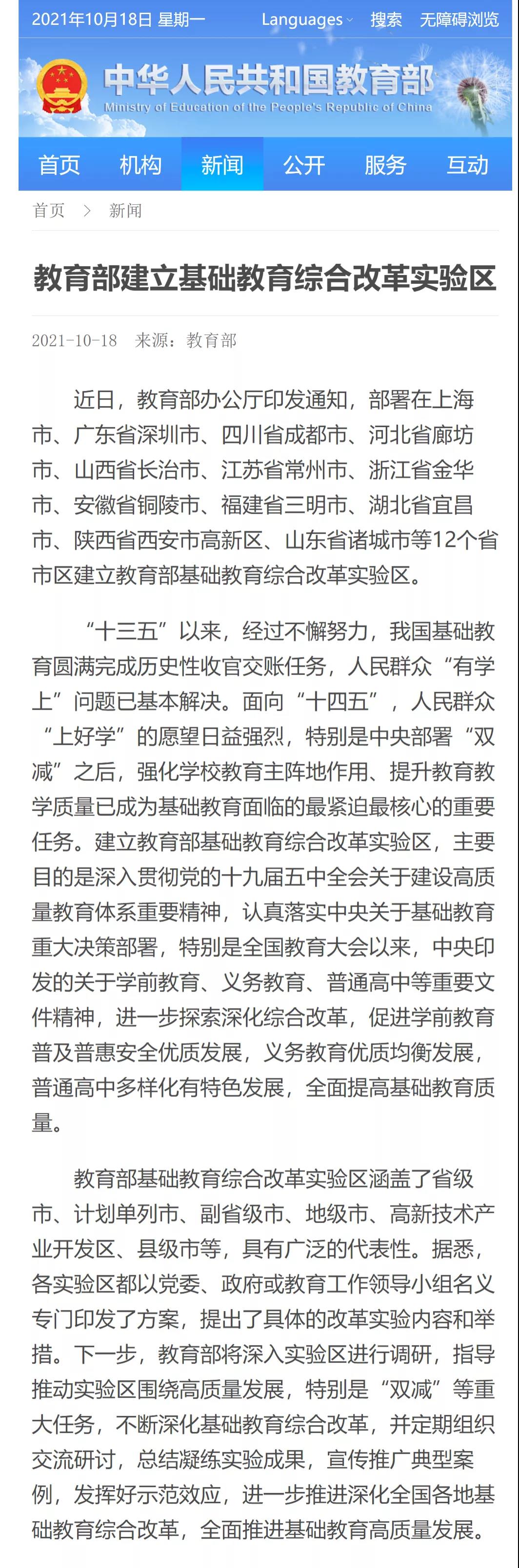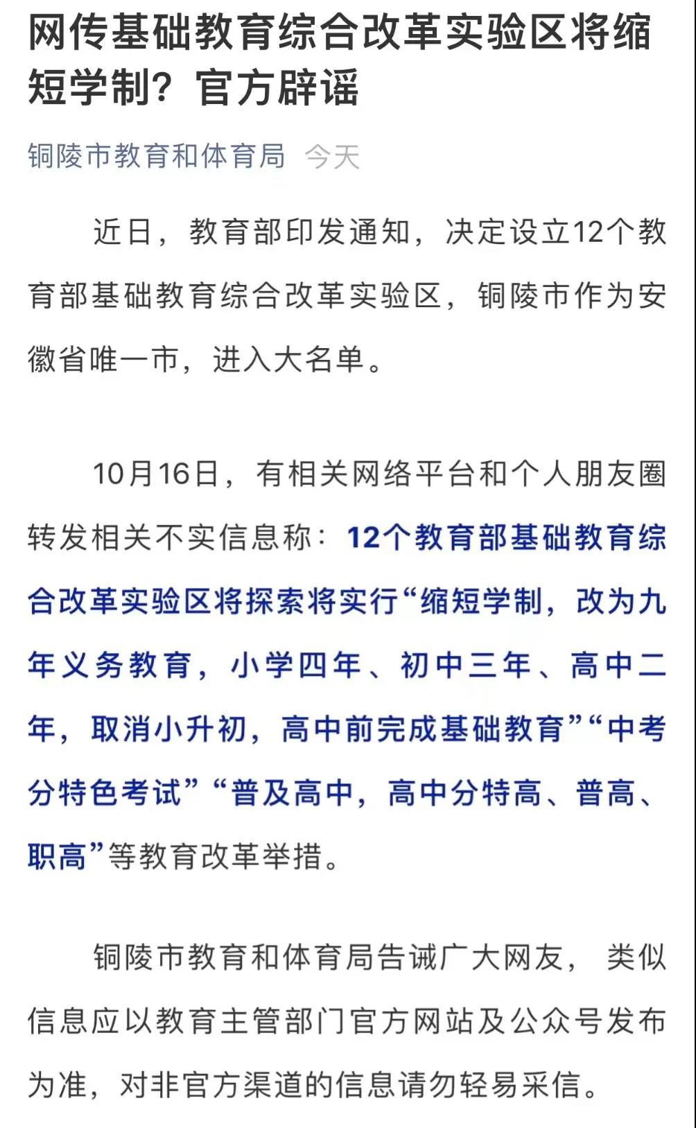 近日,教育部印发关于设立教育部基础教育综合改革实验区的通知,决定在12个省市区建立教育部基础教育综合改革实验区。通知发布后,有微博、微信账号发布“实验区将探索缩短学制、高中前完成基础教育等举措”的不实内容。各实验区就此纷纷辟谣,并提醒网友不要轻易采信非官方渠道的信息。一起来看—— 教育部就“建立基础教育综合改革实验区”进行权威发布 网传深圳或将缩短学制?深圳市教育局:请勿轻易采信非官方渠道的信息 10月17日,某自媒体微信公号发表文章称:教育部基础教育综合改革实验区或将实行“缩短学制”。深圳市教育局相关负责人回应,网上流传关于深圳入选教育部综改实验区后拟推行缩短学制等改革的帖子,类似信息应以各级教育行政部门官方网站及公众号发布为准,对非官方渠道的信息请勿轻易采信。(深圳特区报微博) 成都市教育局辟谣实验区将缩短学制 《教育部办公厅关于设立教育部基础教育综合改革实验区的通知》发布后,网传实验区将缩短学制等。对此,记者向成都市教育局相关工作人员核实,网上该说法并非事实。(四川观察微博) 网传12个基础教育综合改革实验区将缩短学制?浙江省教育厅辟谣 近日,多个自媒体微信公号发文称,我国将开始新一轮教育改革,日前公布的12个教育部基础教育综合改革实验区将探索实行“缩短学制,改为九年义务教育”等教育改革举措。记者登录教育部官网查询,并未发现网文中所提的任何改革举措。记者也第一时间采访了金华教育局,并以《金华入选!教育部公布12个基础教育综合改革实验区》为题,进行了报道。据报道,作为浙江省唯一入选教育部基础教育综合改革实验区的金华,已制定改革实施方案。全文均未提到要缩短学制、中考分特色考试等举措。18日上午,记者再次向浙江省教育厅及金华教育局进行求证。省教育厅和金华教育局相关处室均回复,“没听说此事”。(浙江新闻客户端) 网传基础教育综合改革实验区将缩短学制?安徽省铜陵市教体局官方辟谣 安徽省铜陵市教育和体育局告诫广大网友, 类似信息应以教育主管部门官方网站及公众号发布为准,对非官方渠道的信息请勿轻易采信。铜陵市教育和体育局已通过官方微信发布相关信息。(铜陵市教育和体育局微信号) 网传西安高新区基础教育综合改革9年上完小学到高中?相关部门:正式文件未出台前别轻信 记者向西安市教育局核实后了解到,该说法不可信。另据记者梳理发现,教育部及西安市教育局、高新区教育局的官网、官微等官方信息发布渠道均未见相关改革方案,这些网传说法尚无官方依据。(西部网) 来源 | 综合自深圳特区报、四川观察微博,浙江新闻客户端,铜陵市教育和体育局微信号,西部网等
