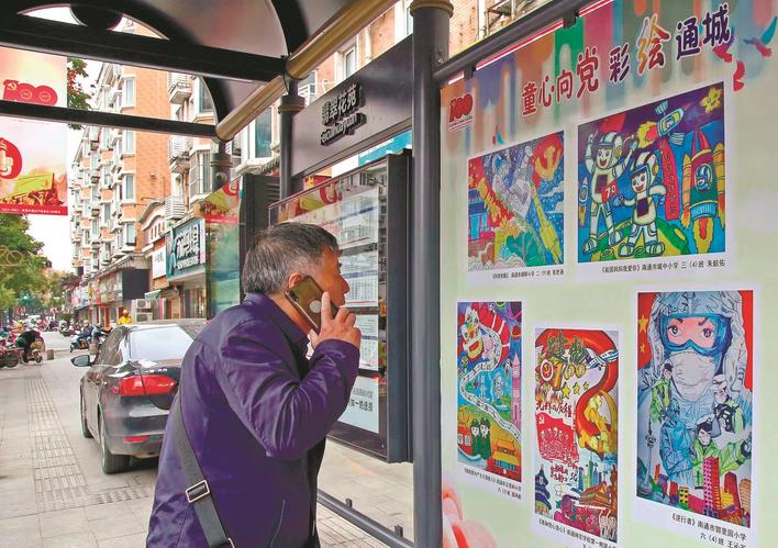 昨天,崇川区濠北路一公交站台“童心向党 彩绘通城”画展,吸引候车人的眼球。“童心向党 彩绘通城”南通市崇川区小学生优秀书画作品展亮相于濠北路沿线12个公交站台,21个版面展出近百幅书画作品。本次活动由崇川区政府、区委宣传部、文明办、区教育体育局和南通市交通运输局、市公交集团联合举办。 李斌