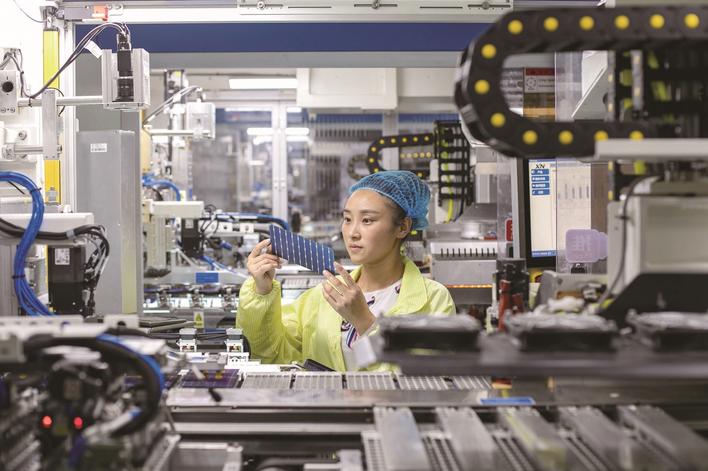 20日,海安经济技术开发区福克斯新能源科技有限公司5G+智慧生产车间内,工人们正在赶制出口高效光伏太阳能组件。 从2020年下半年开始,福克斯新能源科技有限公司设计建设了5G+智慧生产车间,通过5G技术,实现设备互联,数据互联,推动企业改进生产、提升效率。 CFP供图