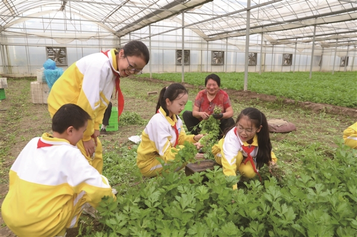 昨日,以“劳动创造幸福”为主题的崇川区青少年劳动教育现场观摩会在幸福街道飞悦农业举行,孩子们在蔬菜大棚学习栽菜、体验干农活。活动旨在进一步引导学生崇尚劳动、尊重劳动,从小养成爱劳动的习惯。 记者 许丛军摄